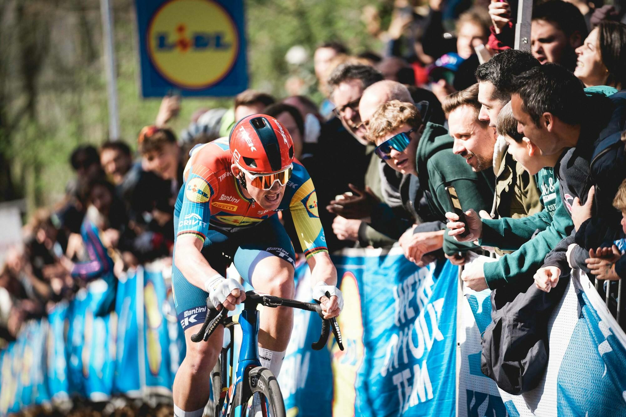En route vers la zone vallonnée, Campenaerts (Team Visma | Lease a Bike) a anticipé avant la première ascension du Baneberg. Peu après, il a rejoint le groupe de tête, qui avançait à vive allure vers la première montée du Kemmelberg et les célèbres Plugstreets. Sur les chemins de gravier, Pedersen a de nouveau secoué le peloton, et seuls Kooij (Team Visma | Lease a Bike), Philipsen et Livyns (Lotto) ont pu suivre. Mais un coup du sort a frappé les poursuivants : Philipsen a crevé et Kooij a fini dans un fossé. Pedersen et Livyns ont rapidement rattrapé le groupe de tête.